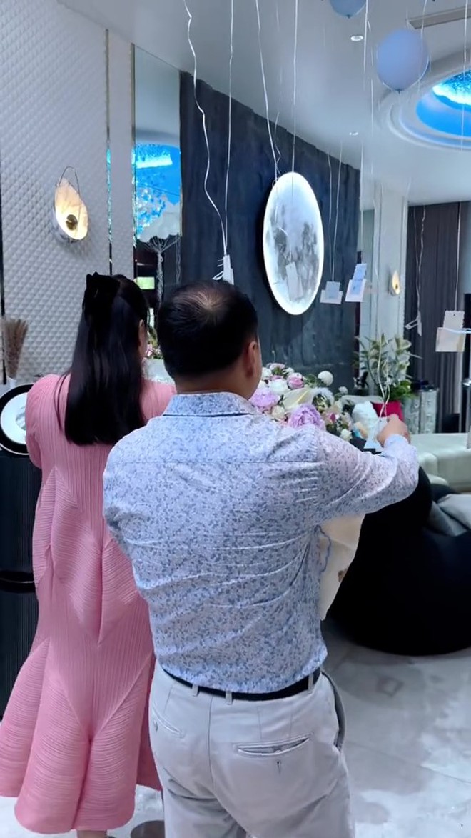 Tại đây, Shark Bình đã thuê ekip đến trang hoàng nhà cửa với hoa tươi và bóng bay. Về phần mình, nam doanh nhân viết 2 bức thư tay dành cho vợ con.