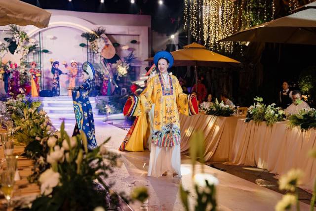 Sự kiện diễn ra vào buổi tối, không gian lộng lẫy, sang trọng của buổi tiệc khiến khách mời phải bất ngờ. Đáng chú ý, Phương Oanh còn khiến quan khách "ồ wao" khi làm người mẫu trình diễn thời trang. Chia sẻ về điều này, nữ diễn viên cho biết, vì Shark Bình từng muốn thấy nữ diễn viên trình diễn thời trang nên cô đã quyết định chiều anh.