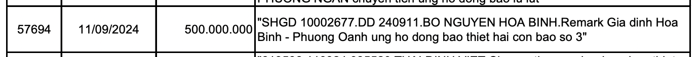 Trong số đó, một trong những giao dịch được nhiều người quan tâm nhất là 500 triệu đồng của vợ chồng Shark Bình - Phương Oanh. Kết quả là đã tìm thấy 500 triệu ủng hộ từ cặp đôi này, trùng khớp với thông tin được chính chủ đăng tải trước đó: “Gia đình Hòa Bình - Phương Oanh ủng hộ đồng bào thiệt hại cơn bão số 3”.