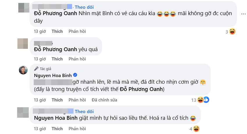 Xem cảnh hậu trường, bạn bè của shark Bình đã bình luận trêu anh có vẻ cáu vì vợ làm chậm. Lập tức ông xã Phương Oanh đáp lại bằng câu trả lời cực hài: "Gỡ nhanh lên, lề mà lề mề, cho nhịn cơm giờ. (Đấy là trong truyện cổ tích viết thế)".
