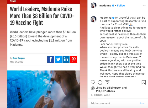 Trong bài đăng của mình, Madonna thể hiện tinh thần cứng rắn khi tuyên bố rằng cô rất hân hạnh được góp 1 phần công sức trong công cuộc nghiên cứu, tìm ra phương pháp chữa trị. Madonna đã cùng các lãnh đạo cấp cao thế giới chung tay quyên góp số tiền 8 tỷ đôla (184 ngàn tỷ đồng) cho công tác nghiên cứu và phát triển vaccine chống dịch, trong số đó, nữ hoàng nhạc Pop đã quyên góp 1,1 triệu đôla (25,3 tỷ đồng) cho hoạt động này.