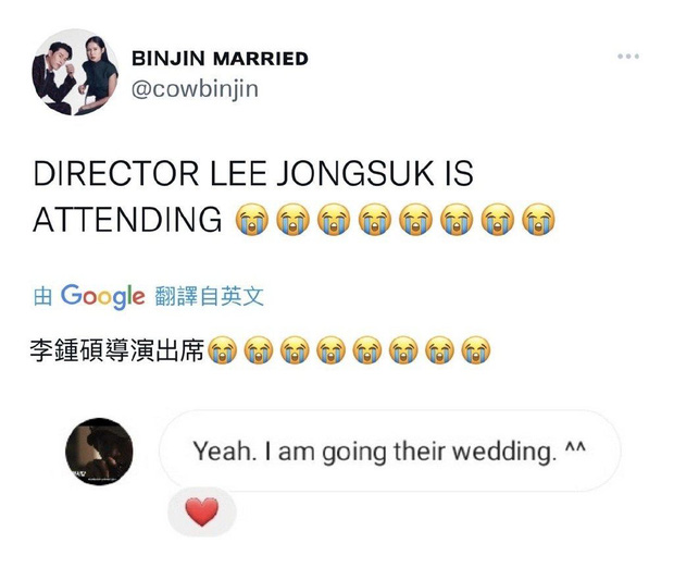 Đạo diễn Lee Jong Suk xác nhận với fan sẽ tới dự đám cưới của cặp đôi đình đám. Ông chính là đạo diễn của Negotiation - tác phẩm đầu tiên Hyun Bin và Son Ye Jin bén duyên.