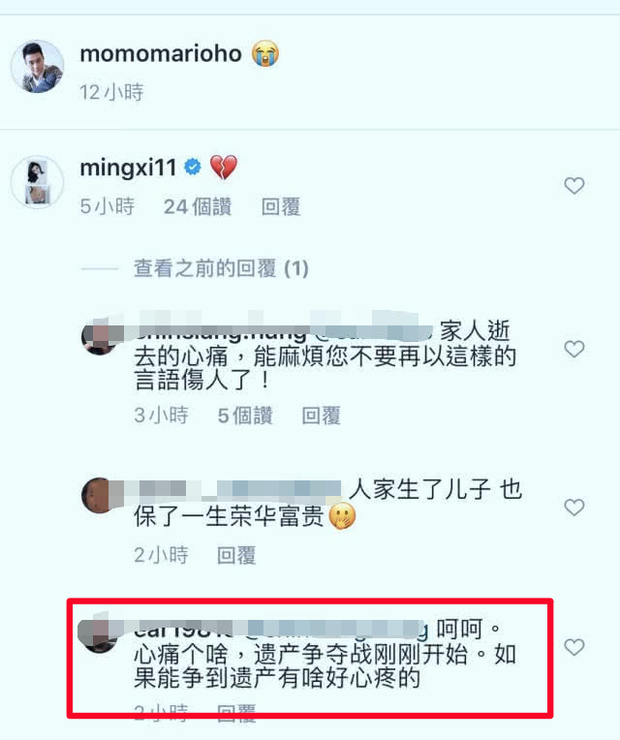Cụ thể, khi ông xã Hà Du Quân của cô chia sẻ lại hình ảnh lúc nhỏ của mình bên anh trai và bố mẹ, Ming Xi đã để lại bình luận là biểu tượng trái tim tan vỡ. Điều đáng nói, ngay sau dòng bình luận này, nữ siêu mẫu đã bị công kích bởi một dân mạng: "Haha, cô đau lòng cái gì. Cuộc chiến gia sản vừa mới bắt đầu, nếu như có thể giành được thì đã chẳng buồn lòng đến vậy đâu nhỉ?".