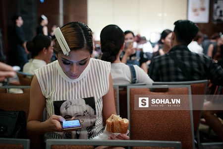 Sau khi tập xong, Hoàng Yến trở lại khu vực hậu trường. Chị tiếp tục "xử lý" chiếc bánh mỳ và tranh thủ xử lý công việc qua điện thoại. |