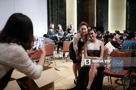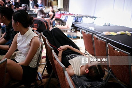 Vì các khách mời vẫn chưa đến đủ nên chương trình chưa thể bắt đầu. Quá mệt, Hoàng Yến ngủ thiếp đi trên băng ghế trang điểm. Đây là hình ảnh thường thấy đối với các người mẫu. |