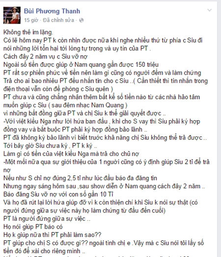 Theo đó, hồi tháng 7/2013, khi "chị Siu" bị vỡ nợ lên đến vài tỷ đồng, Phương Thanh đã kêu gọi nghệ sĩ, các mạnh thường quân giúp đỡ đồng nghiệp. Thậm chí, chị còn đứng ra thỏa thuận với các chủ nợ khi họ liên tục nhắn tin đe dọa cựu giám khảo Vietnam Idol. Hành động của nữ ca sĩ Lời chưa nói khi đó ghi điểm với người hâm mộ.