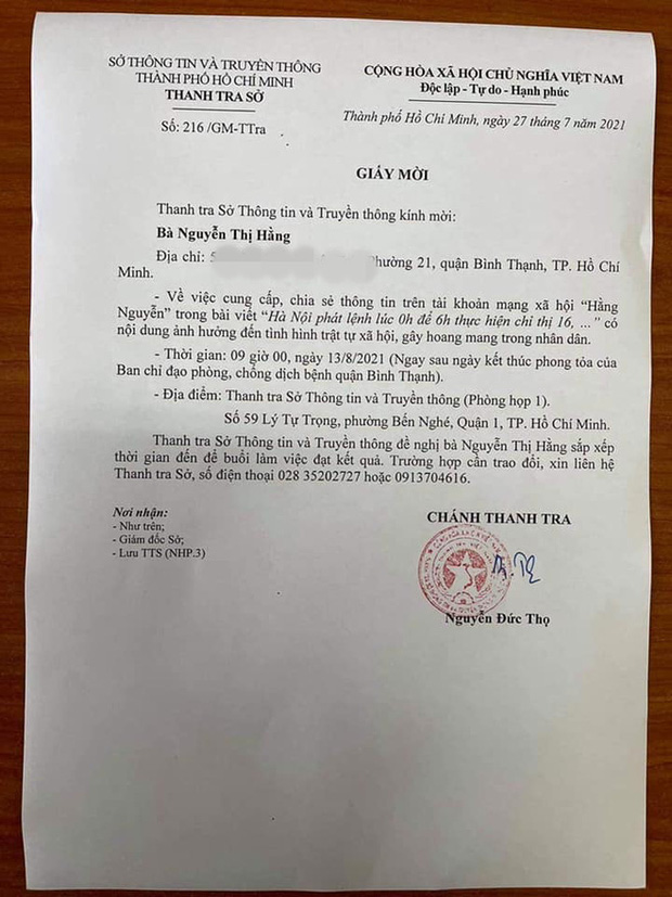 Theo nội dung giấy mời, phía thanh tra Sở Thông tin và Truyền thông ghi rõ sẽ làm việc với bà Hằng vào 9h ngày 13/8/2021 "về việc cung cấp, chia sẻ thông tin trên tài khoản mạng xã hội Nguyễn Hằng... có nội dung ảnh hưởng đến tình hình trật tự xã hội, gây hoang mang trong nhân dân".