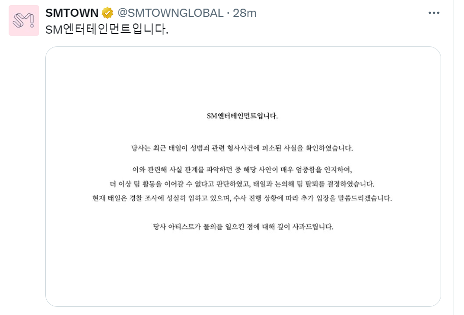 Vào ngày 28/8, SM Entertainment bất ngờ đưa ra thông báo Taeil (NCT) bị buộc tội trong 1 vụ án hình sự liên quan đến tội phạm tình dục. Vì vấn đề rất nghiêm trọng nên công ty đã đưa đến quyết định sẽ để nam idol này rời khỏi nhóm.