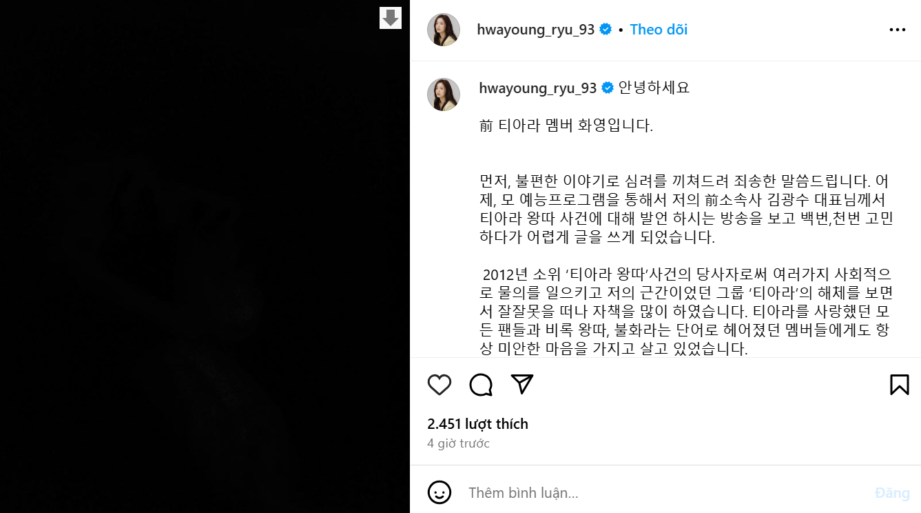 Đến ngày 10/11, Hwayoung đăng 1 bài viết dài nhằm phản pháo lại những lời CEO Kim Kwang Soo nói. Hwayoung cho biết cô bị T-ara bạo hành, bắt nạt và chửi bới chứ không hề giả làm nạn nhân. Nữ rapper này đã im lặng suốt 12 năm qua, cô bức xúc vì Kim Kwang Soo khơi lại câu chuyện và biến cô thành nhân vật phản diện.