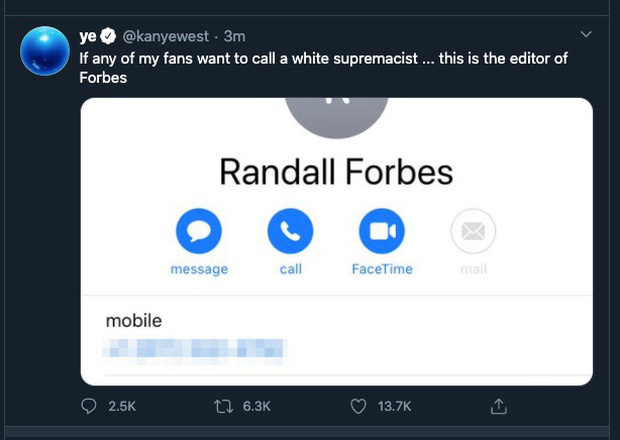 Khoảng 1 giờ rạng sáng nay, Kanye vẫn không có dấu hiệu ngừng chia sẻ tweet trên Twitter. Chủ nhân bản hit Stronger thậm chí còn đăng đích danh số điện thoại của Biên tập viên tạp chí Forbes - Randall Forbes không rõ lý do, gọi anh này với ngôn từ mang tính phân biệt chủng tộc. Hành động này đã khiến các netizen quá khích "nã" điện thoại của Randall Forbes. Việc công bố thông tin riêng tư này có thể khiến Kanye vướng vào kiện tụng. Tuy nhiên sau 10 phút, dòng tweet này tạm thời bị gỡ xuống và bị gửi về đội kiểm duyệt thông tin của Twitter để xem xét tính chất nhạy cảm.