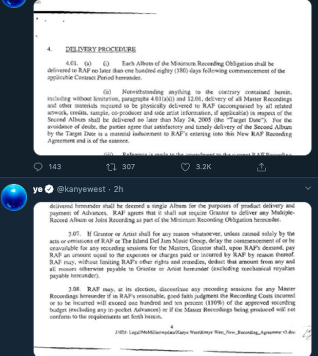 Kanye còn nói rằng ngành công nghiệp âm nhạc và liên đoàn bóng rổ Mỹ NBA chỉ là những kẻ nô lệ. Kanye cho biết, anh không chỉ có 1 hợp đồng với Universal mà có tới tận 10 hợp đồng khác nhau. Nam rapper "spam" Twitter bằng ảnh chụp hàng chục trang hợp đồng đã ký của mình với Universal. Việc tung văn bản hợp đồng công khai như thế này có thể khiến Kanye West gặp vấn đề lớn về pháp lý.