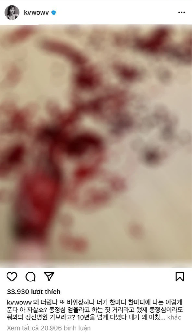 Đính kèm bức ảnh cổ tay đầy máu, nữ idol viết: "Tại sao các người lại ghê tởm đến thế? Mỗi khi các người nói, tôi lại giải quyết như thế này đây. Khoe khoang chuyện tự tử à? Các người nói về lòng từ bi, thì hãy cho tôi xin chút từ bi. Các người muốn tôi đến phòng khám tâm thần ư? Tôi đến đó 10 năm nay rồi. Tại sao tôi lại phát điên, còn lời các người nói lại ở trong con người tôi? Tôi bị chà đạp, bị xé nát mỗi ngày, cứ làm việc chăm chỉ và sống như 1 đứa ngốc".