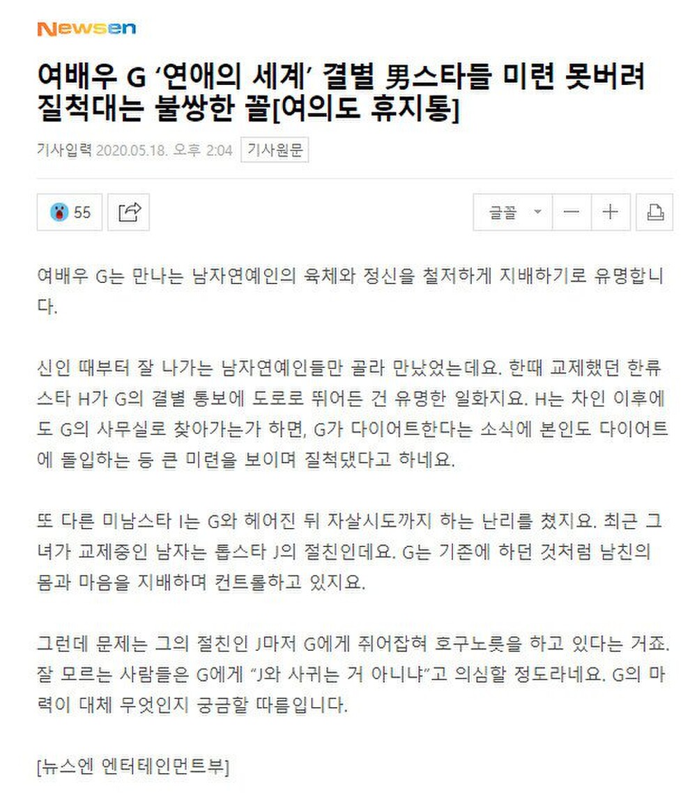 Năm ngoái, hãng truyền thông Newsen đăng tải tin đồn liên quan đến một nữ ngôi sao và những người bạn trai nổi tiếng của cô ấy. Theo bài báo, nữ diễn viên G khét tiếng vì hoàn toàn thống trị và kiểm soát bạn trai nổi tiếng cả về thể chất lẫn tinh thần.
