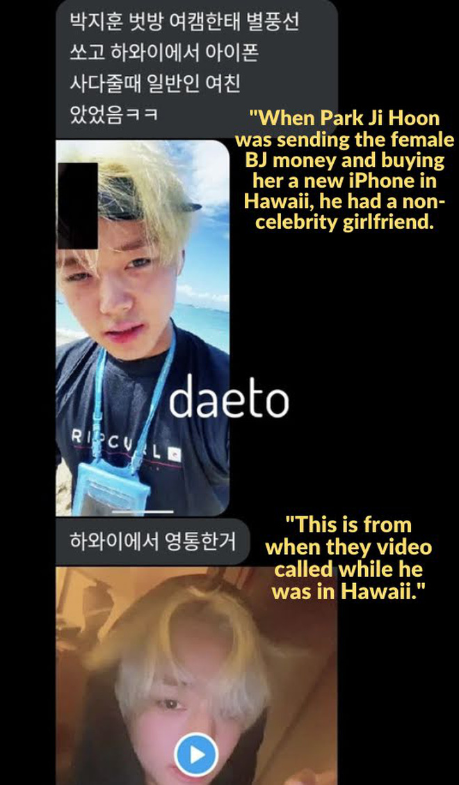Mọi chuyện bắt đầu kể từ 1 cáo buộc ẩn danh trên Twitter. Sau đó, netizen này đã nhận được tin nhắn của 1 người tự xưng là bạn gái cũ của Park Ji Hoon (tạm gọi là A). Cô gái này tố cáo trong khoảng thời gian hẹn hò, nam idol đã sử dụng tên giả là Jung Hyun Ho để ngoại tình, chi hàng chục triệu won (10 triệu won = 200 triệu đồng) cho 1 BJ chuyên khoe thân. A đã gửi kèm ảnh từ cuộc gọi video của cô và Park Ji Hoon làm bằng chứng, chứng minh cô đã từng hẹn hò với nam idol.