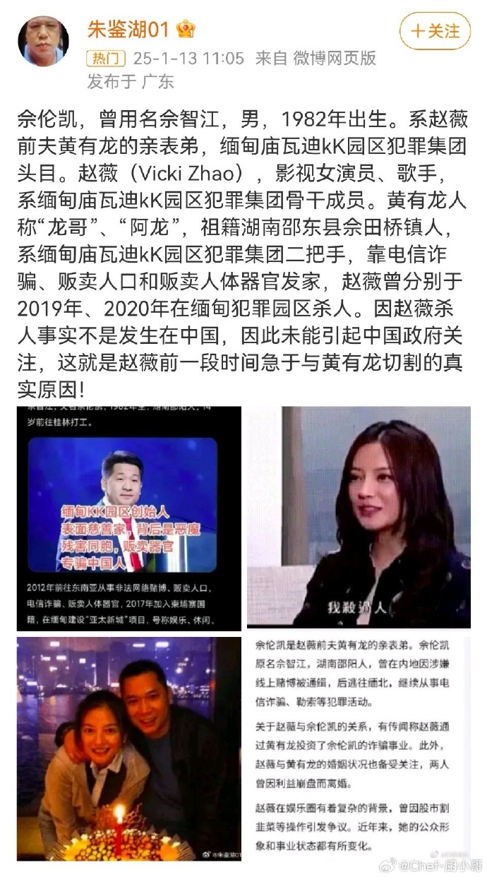 Trước đó, ngày 28/12, Triệu Vy đã chính thức đăng Weibo thông báo đã ly hôn với chồng tỷ phú Huỳnh Hữu Long từ nhiều năm trước.