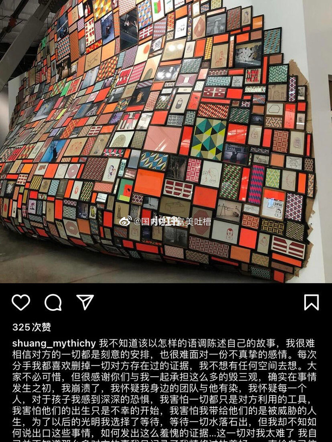 Trước đó, nữ diễn viên đăng 1 tấm hình bức tường sặc sỡ kèm dòng nhắn: "Tôi không biết phải dùng giọng điệu gì để miêu tả lại câu chuyện của bản thân. Không thể tin nổi rằng tất cả đều là sự sắp đặt cố ý của đối phương, tôi cũng không dám đối mặt với chuyện tình cảm giả dối. Ban đầu khi sự việc xảy ra, tôi đã vô cùng suy sụp. Tôi còn nghĩ ekip xung quanh và anh ta cấu kết với nhau, sợ con cái và tất cả mọi người trở thành công cụ để anh ta lợi dụng, sợ rằng khi các con ra đời sẽ là khởi đầu của chuỗi bất hạnh".