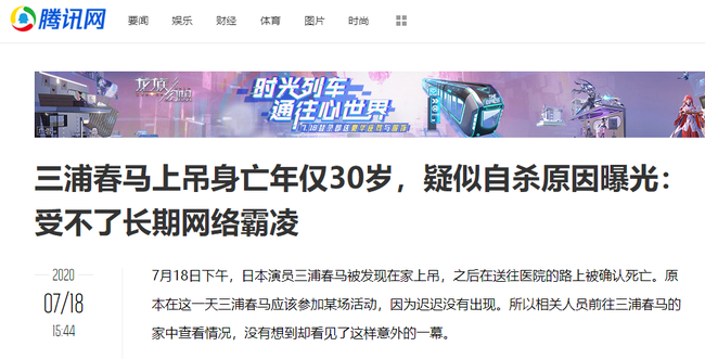 Truyền thông Nhật Bản đưa tin, nam diễn viên Miura Haruma (30 tuổi) được tìm thấy trong tình trạng treo cổ lúc 13 giờ (giờ địa phương) ngày 18/7 tại nhà riêng ở Minato-gu, Tokyo. Cảnh sát cũng tìm thấy một bức thư được cho là thư tuyệt mệnh mà Miura Haruma để lại trước khi tự tử. Tuy nhiên, nội dung cụ thể trong bức thư vẫn đang được giữ bí mật.