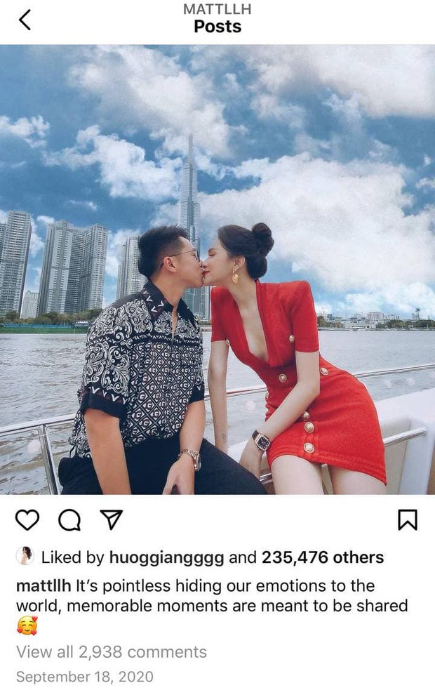 Điều này hoàn toàn khác với trước đây, bởi nàng Hậu đều auto "thả tim" các bài đăng của Matt Liu trên Instagram. Qua tìm hiểu, tương tác cuối của Hương Giang dành cho chàng rơi vào giữa tháng 18/9/2020 là bức ảnh cặp đôi khoá môi nhau trên du thuyền. Nàng Hậu "thả tim" ngay khi bạn trai chia sẻ khoảnh khắc này. Sau đó cặp đôi có thêm nhiều lần chụp ảnh chung nhưng Hương Giang không còn tương tác ở bài đăng của bạn trai cho tới nay. Và nếu để ý kĩ, fan sẽ sớm nhận ra bài đăng gần đây nhất của cặp đôi liên quan đến nhau là vào dịp lễ Valentine 14/2 vừa qua.