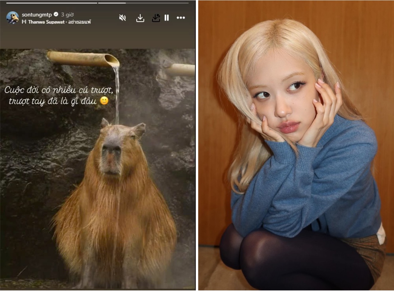 Không để khán giả đồn đoán, Sơn Tùng M-TP đính chính anh lỡ tay nhấn theo dõi Rose (BlackPink). "Cuộc đời có nhiều cú trượt, trượt tay đã là gì đâu", Sơn Tùng đăng story, sau đó hủy theo dõi trang cá nhân của idol Hàn Quốc.