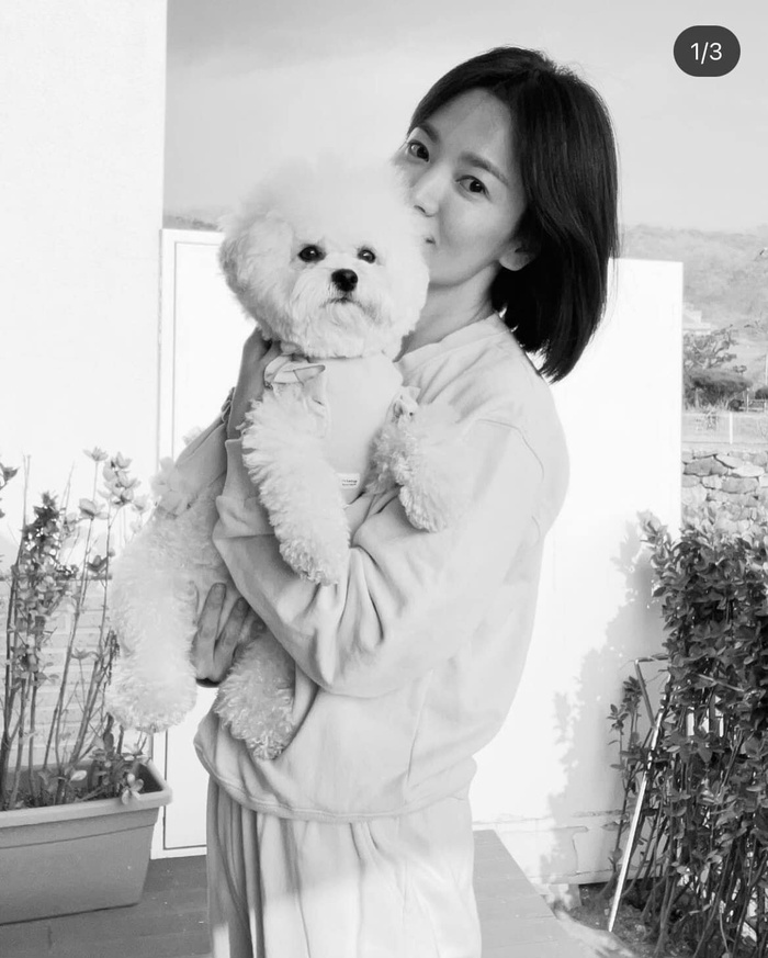 Cụ thể, Song Hye Kyo vừa đăng 3 tấm ảnh chụp cùng thú cưng bao gồm 1 ảnh màu và 2 ảnh đen trắng. Như thường lệ, mỹ nhân lại mượn người bạn lắm lông này che đi một phần gương mặt.