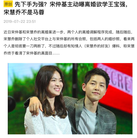 Trang Sohu cho biết, Song Hye Kyo chẳng phải Mã Dung. Song Hye Kyo không ngoại tình với quản lý của Song Joong Ki, cũng chẳng hề phụ thuộc vào tài chính của chồng như vợ của Vương Bảo Cường. Song Hye Kyo debut làng giải trí đã 23 năm, danh tiếng trong giới giải trí còn lớn hơn Song Joong Ki rất nhiều. Song Joong Ki trước đó đã có danh tiếng nhất định, tuy nhiên nhờ vào "Hậu Duệ Mặt Trời" mà trở thành ngôi sao tuyến 1, có thêm lực lượng người hâm mộ hùng hậu.