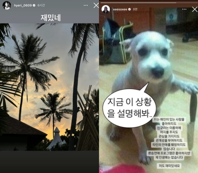Vụ bê bối tình cảm bắt đầu bị thổi bùng lên khi Hyeri đăng lên Instagram story 1 bức ảnh khu nghỉ dưỡng cùng chú thích "Thật thú vị" vào 11h45 trưa ngày hôm đó rồi hủy theo dõi bạn trai cũ trên Instagram sau 1 tiếng. Từ đây, tin đồn Han So Hee làm tiểu tam phá hoại cặp Hyeri - Ryu Jun Yeol càn quét mọi ngóc ngách MXH.
