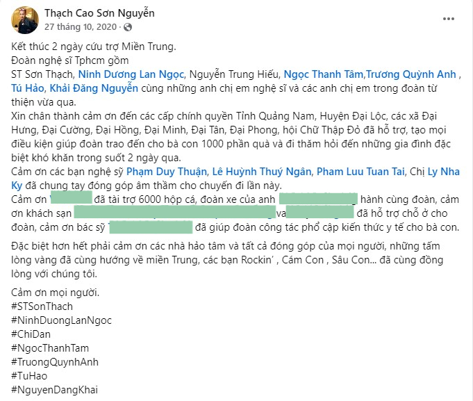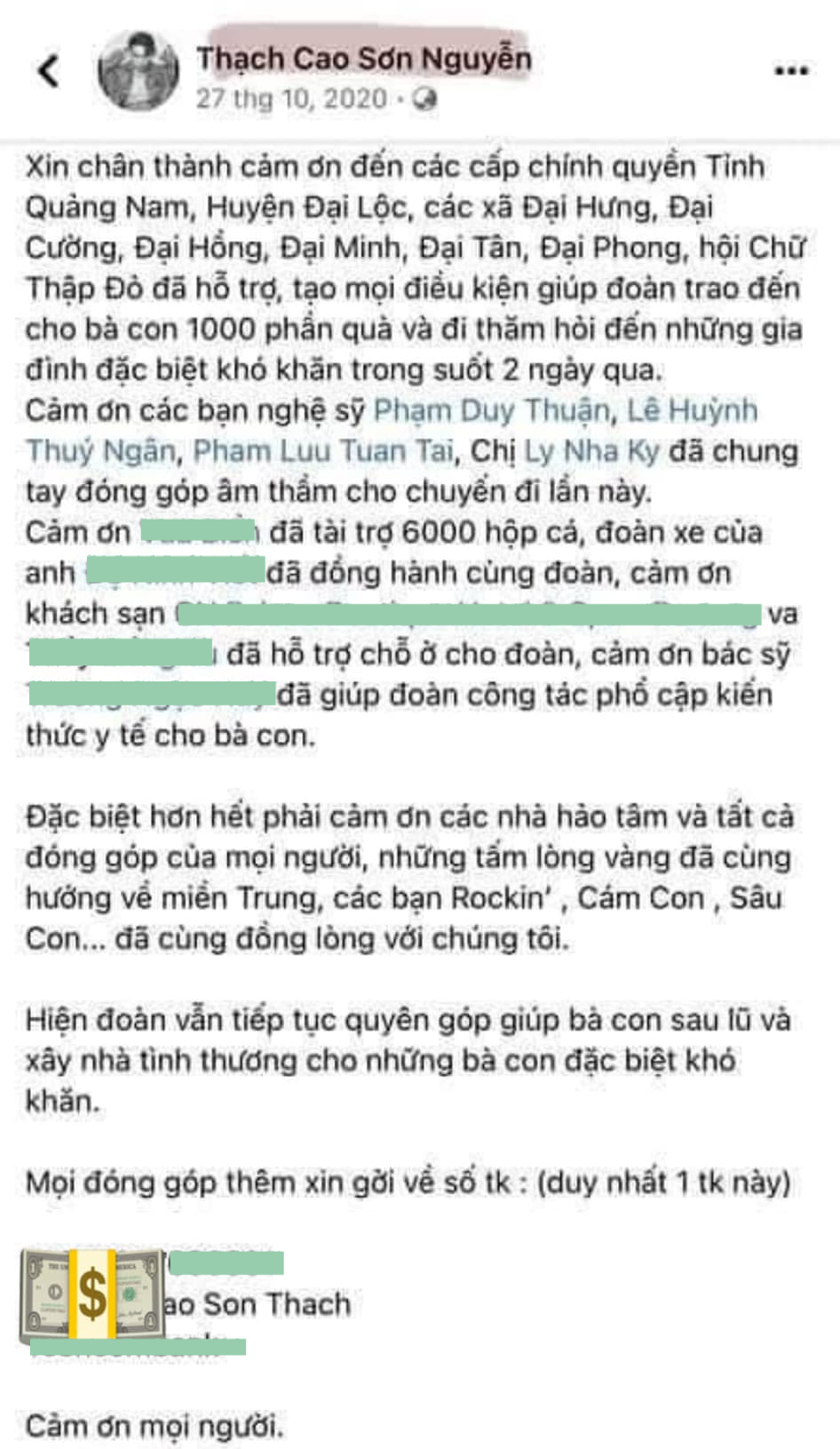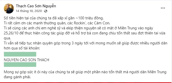 Ngày 17/10/2020, S.T Sơn Thạch được cho là qua bài đăng trên tài khoản cá nhân để thông báo đã nhận được 400 triệu đồng vào số tài khoản làm từ thiện. Ngày 24/10/2020, trên trang cá nhân, Ngọc Thanh Tâm thông báo đã chuyển số tiền 300 triệu vào số tài khoản của S.T Sơn Thạch. Sau đó, ngày 25/10/2020, S.T Sơn Thạch cùng đoàn nghệ sĩ có mặt tại địa điểm làm từ thiện. Ngày 27/10/2020, S.T Sơn Thạch đăng tải hình ảnh đoàn nghệ sĩ ở miền Trung, nam ca sĩ cho biết kết thúc 2 ngày ở miền Trung đã phát 1000 phần quà và thăm hỏi bà con khó khăn. Trong bài đăng này, phần cuối của bài viết S.T Sơn Thạch tiếp tục để thông tin số tài khoản ngân hàng để kêu gọi tiếp.