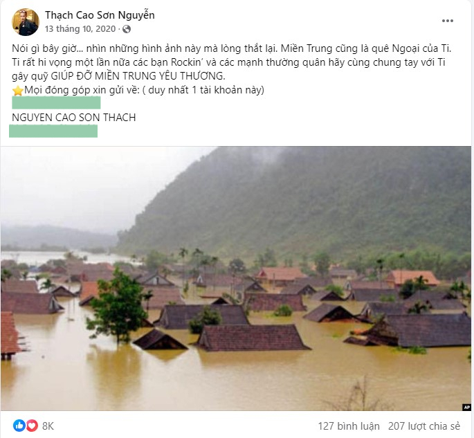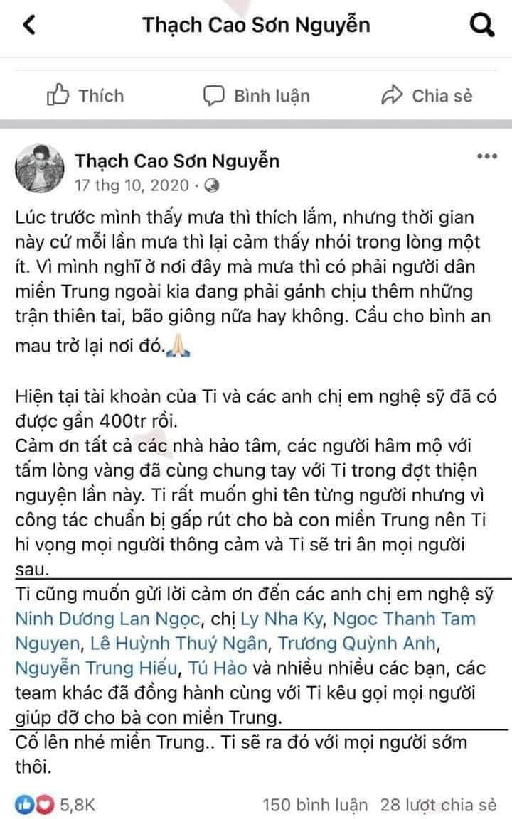 Mới đây, mạng xã hội xôn xao bài viết yêu cầu ca sĩ S.T Sơn Thạch làm rõ các vấn đề trong chuyến từ thiện miền Trung vào năm tháng 10/2020. Theo đó, bài viết này điểm ra các bài đăng kêu gọi đóng góp vào số tài khoản cá nhân của S.T Sơn Thạch. Đợt 1 là vào ngày 13/10/2020, S.T Sơn Thạch được cho là đăng bài vận động mọi người chung tay ủng hộ đồng bào bão lũ miền Trung. Bài đăng của S.T Sơn Thạch được nhiều nghệ sĩ như Chi Dân, Lan Ngọc, Ngọc Thanh Tâm, Tú Hảo, Jun Phạm hưởng ứng và chia sẻ về trang cá nhân để kêu gọi chung.