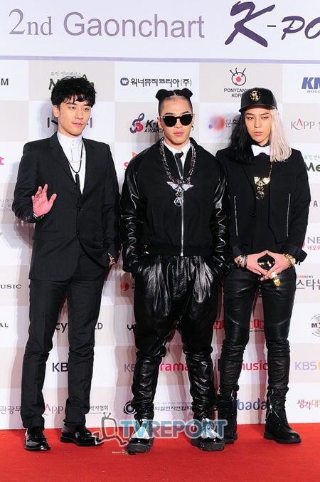 Taeyang (giữa) bên cạnh 2 thành viên cùng nhóm Big Bang gồm G-Dragon và Seungri |