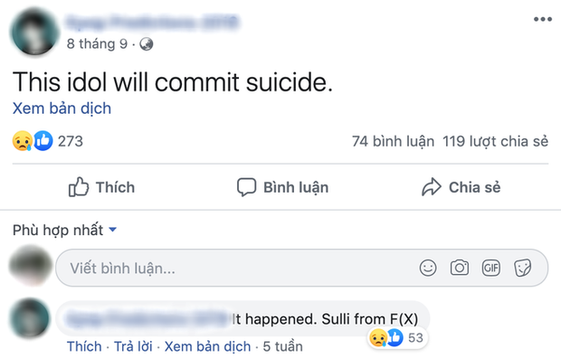Sau cái chết của hai nữ ca sĩ nổi tiếng, dân mạng Hàn Quốc đã tìm lại một tài khoản Facebook từng đưa ra dự đoán về "cái chết của một thần tượng" Kpop vào ngày 08/09. Hơn nột tháng sau, người này nhận rằng lời "tiên đoán" đã trở thành hiện thực khi nhắc đến cái chết của Sulli.