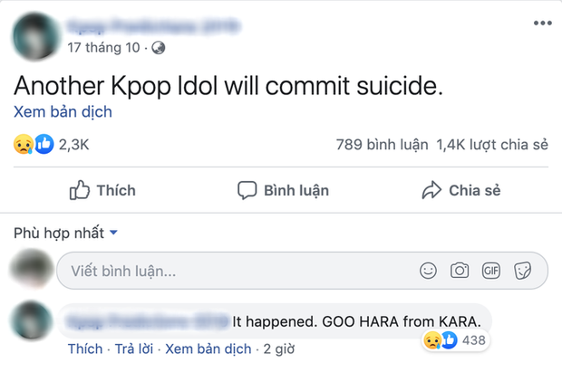 Tới 17/10, tức là 3 ngày sau khi Sulli qua đời, tài khoản này lại đăng thêm một dòng "tiên đoán" nữa, nói rằng sẽ có thêm một thần tượng Kpop tự tử. Ngày hôm nay 24/11, chủ tài khoản đã trở lại bài đăng này và nói rằng "tiên đoán" một lần nữa đúng khi Goo Hara qua đời tại nhà riêng.