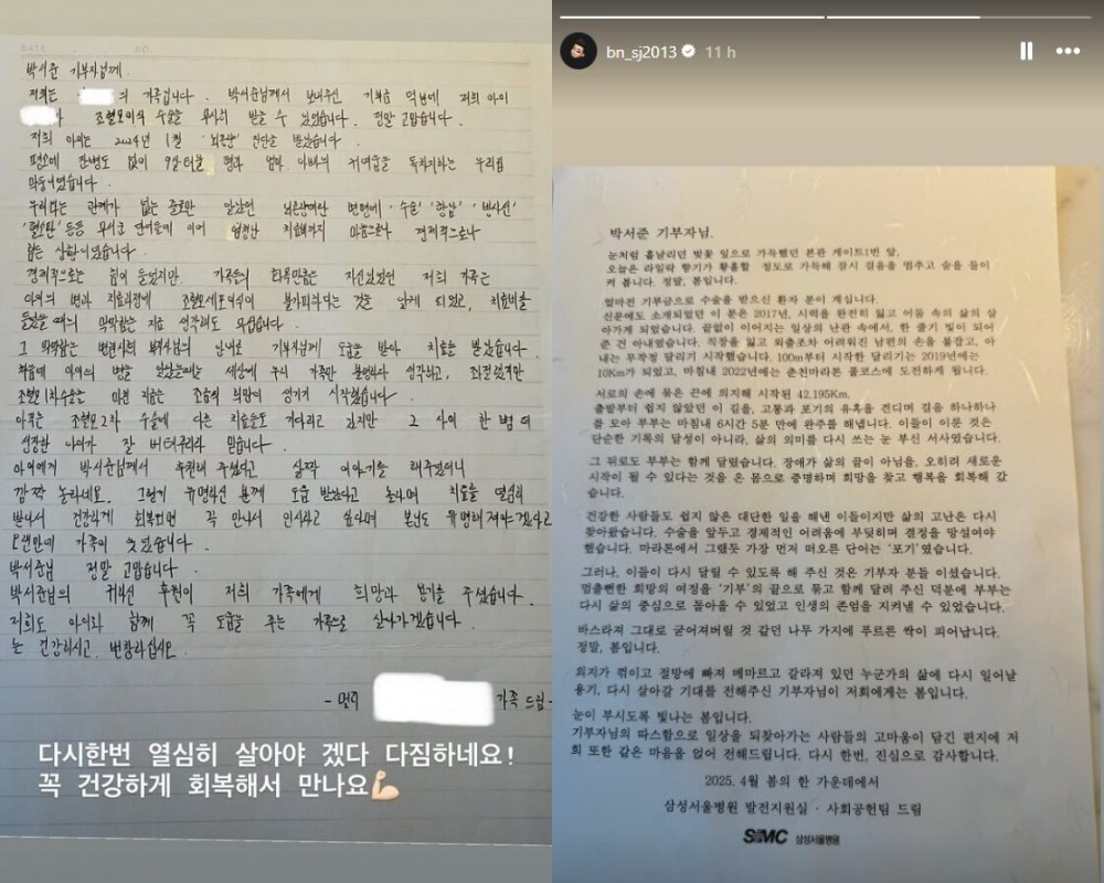 Ngày 29/4, Park Seo Joon bất ngờ chia sẻ trên Instagram một bức thư tay kèm chú thích: "Tôi lại có thêm quyết tâm để sống một đời tử tế. Mong rằng chúng ta sẽ gặp lại nhau khi cháu hồi phục và thật khỏe mạnh nhé". Đáng chú ý, nội dung bức thư chính là lời cảm ơn từ một vị phụ huynh có con bị bệnh hiểm nghèo. Em nhỏ này được chẩn đoán u não từ tháng 1/2024 và vừa trải qua ca ghép tế bào gốc tạo máu. Đặc biệt hơn cả, cuộc phẫu thuật này được diễn ra suôn sẻ là vì nhờ sự hỗ trợ tài chính từ chính Park Seo Joon.