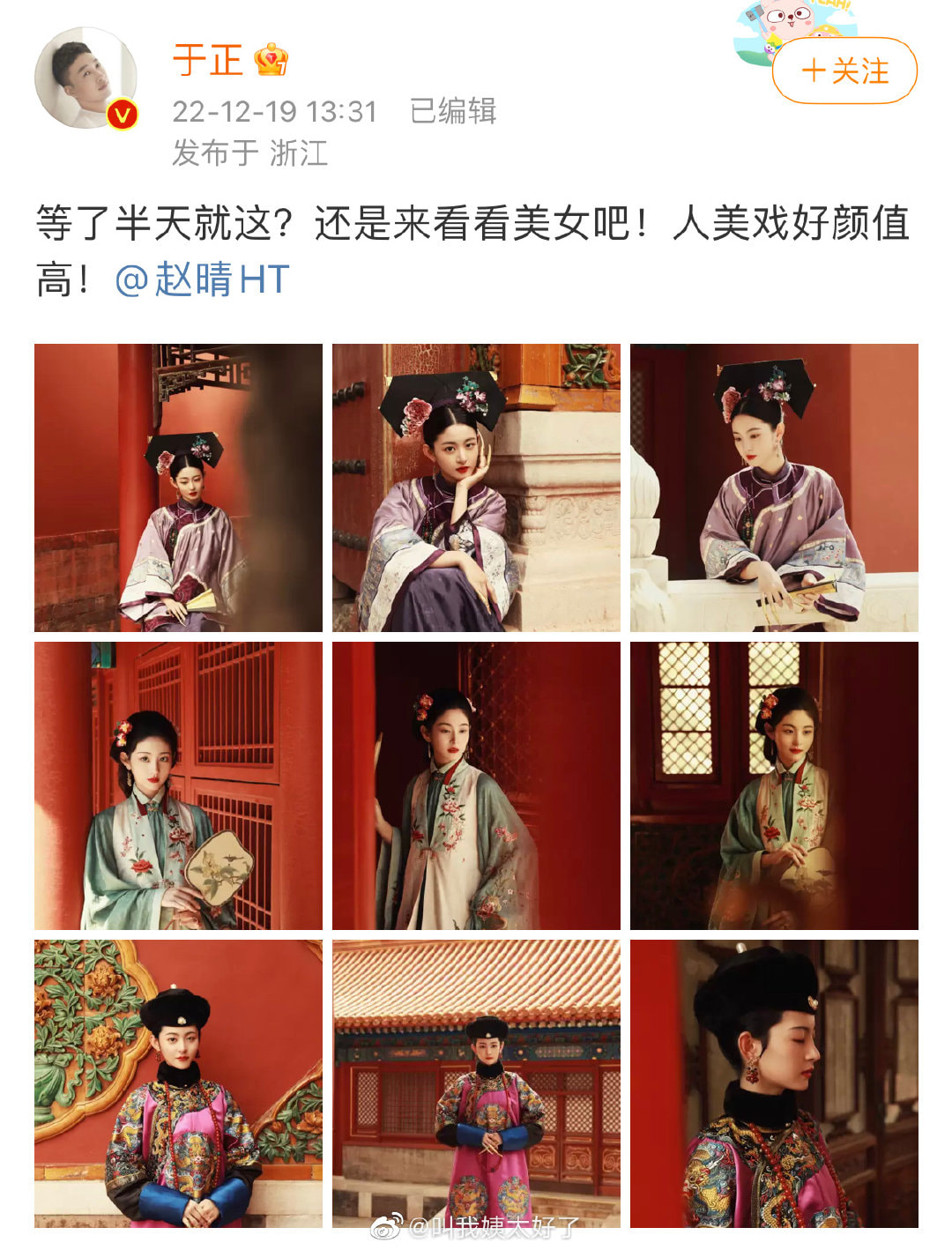 Đứng trước tin hẹn hò của hai “gà cưng”, Vu Chính không những không lên tiếng phủ nhận mà còn đăng loạt ảnh của Triệu Tình trong tạo hình cổ trang kèm dòng trạng thái khó hiểu: “Đợi cả buổi mà chỉ thế này thôi á? Thôi đi xem mĩ nhân nè, vừa xinh đẹp lại diễn hay”