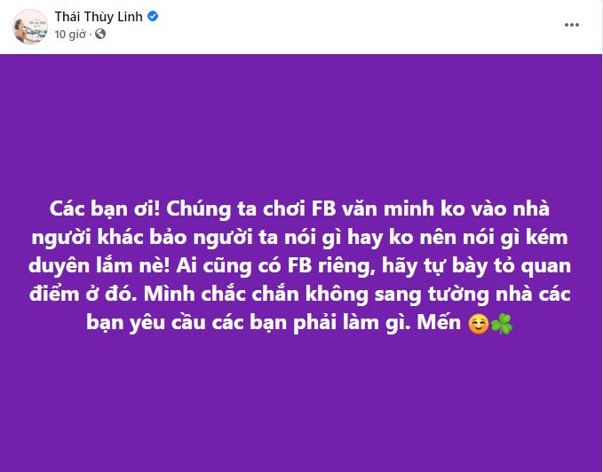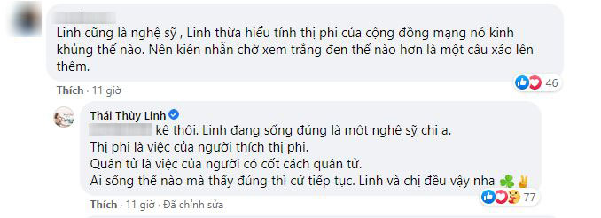 Đáp lại những ý kiến trên, Thái Thùy Linh vẫn giữ vững quan điểm của mình và đăng tải thêm một status mới với nội dung đanh thép: "Các bạn ơi! Chúng ta chơi Facebook văn minh không vào nhà người khác bảo người ta nói gì hay không nên nói gì kém duyên lắm nè! Ai cũng có Facebook riêng, hãy tự bày tỏ quan điểm ở đó. Mình chắc chắn không sang tường nhà các bạn yêu cầu các bạn phải làm gì. Mến".