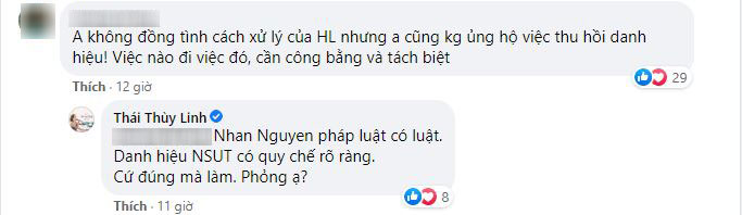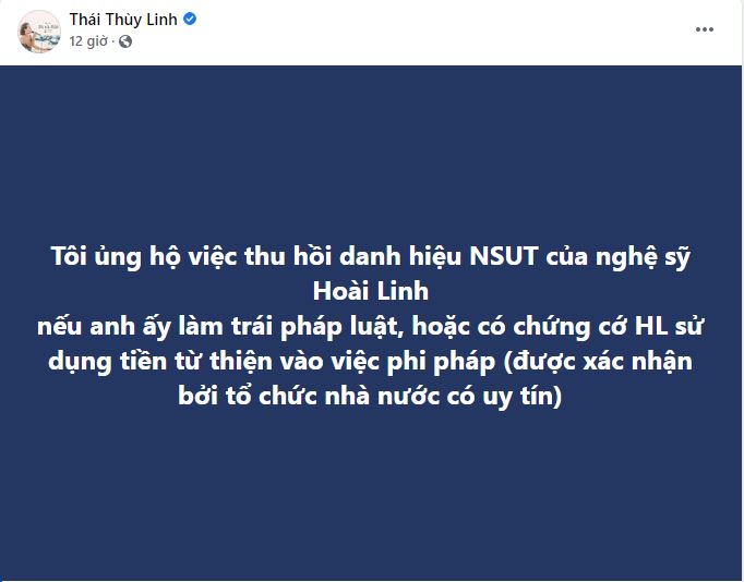 Cụ thể, Thái Thùy Linh chia sẻ: "Tôi ủng hộ việc thu hồi danh hiệu NSƯT của nghệ sỹ Hoài Linh nếu anh ấy làm trái pháp luật, hoặc có chứng cớ Hoài Linh sử dụng tiền từ thiện vào việc phi pháp (được xác nhận bởi tổ chức nhà nước có uy tín)".