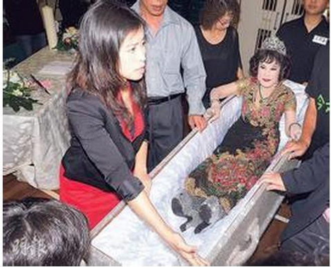 Không dừng lại ở đó, người phụ nữ này còn "điên rồ" đến mức tự tổ chức một đám tang dành cho riêng mình ngay khi còn sống, tiêu tốn hết 1,8 triệu đôla Hong Kong (5,6 tỷ đồng). Trong "tang lễ, Hoàng Hạ Huệ mặc quần áo sặc sỡ, đầu đội vương miện, tươi cười... nằm trong quan tài.