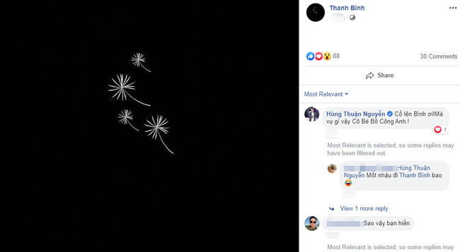 Giữa lúc lùm xùm hậu ly hôn vẫn chưa lắng xuống, Thanh Bình bỗng nhiên đổi ảnh đại diện và ảnh bìa trên trang cá nhân sang màu đen với hình hoa bồ công anh. Dù không rõ chuyện gì nhưng đông đảo bạn bè, người hâm mộ đều rất lo lắng cho nam diễn viên, liên tục gửi lời động viên mong anh sớm vượt qua khoảng thời gian khó khăn này.