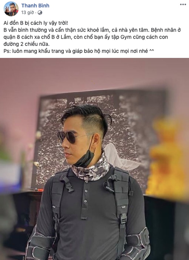 Thanh Bình viết trên trang cá nhân: "Ai đồn Bình bị cách ly vậy trời! Bình vẫn bình thường và cẩn thận sức khoẻ lắm, cả nhà yên tâm. Bệnh nhân ở quận 8 cách xa chỗ Bình ở lắm, còn chỗ bạn ấy tập gym cũng cách con đường 2 chiều nữa. PS: luôn mang khẩu trang và giáp bảo hộ mọi lúc mọi nơi nhé!".