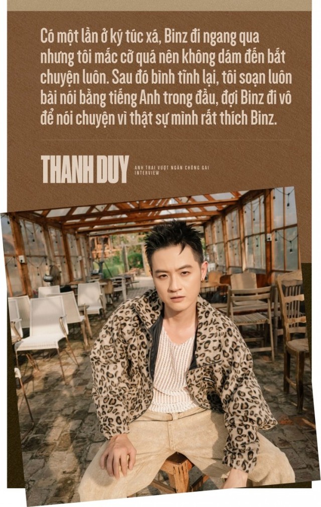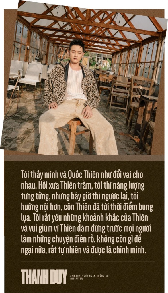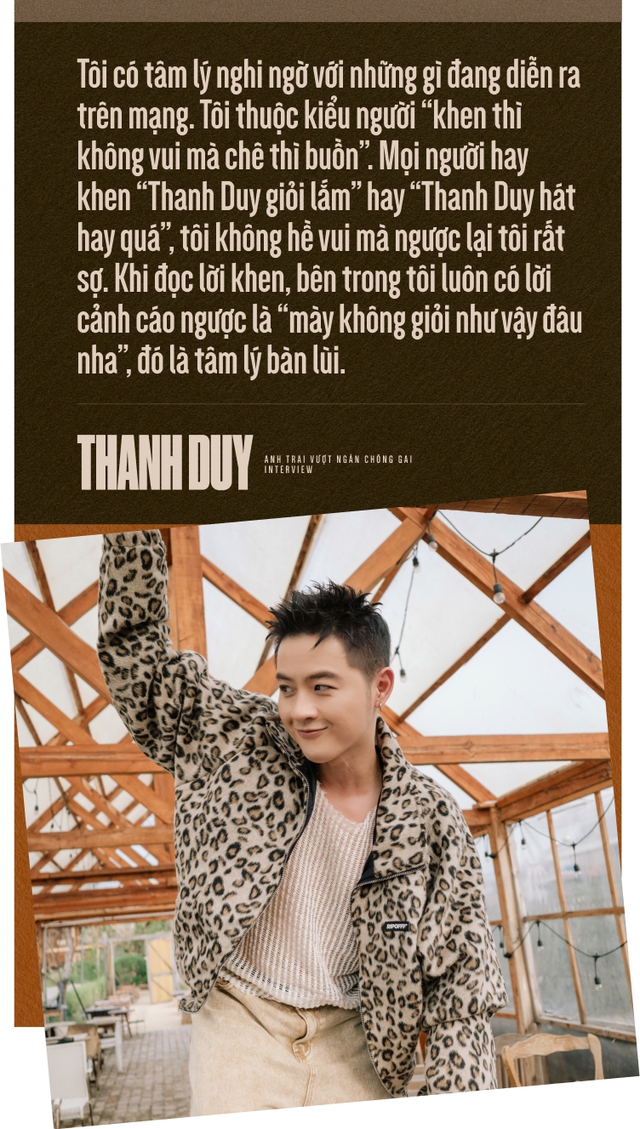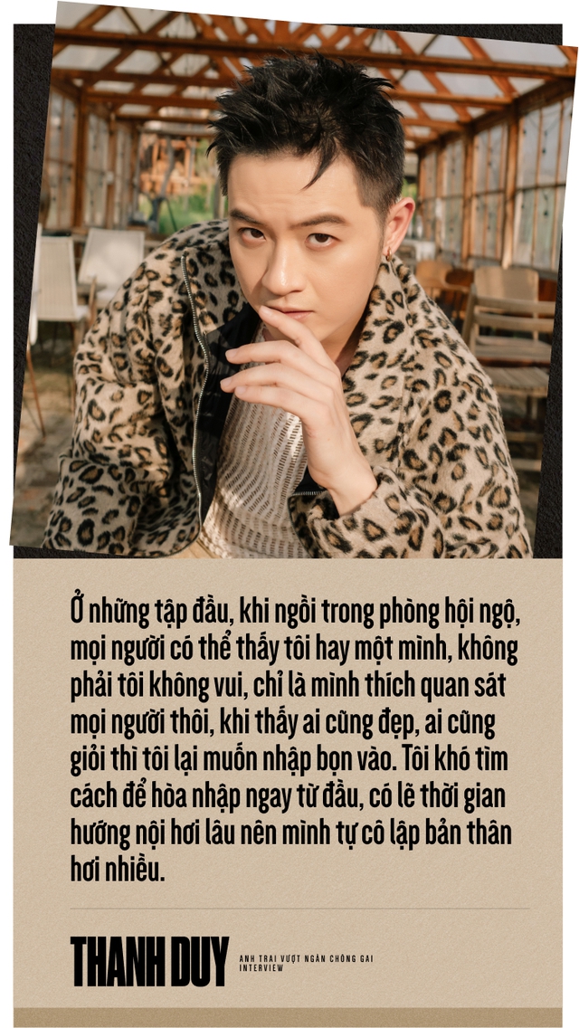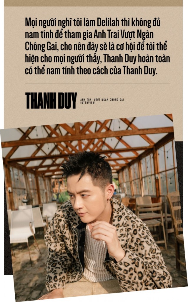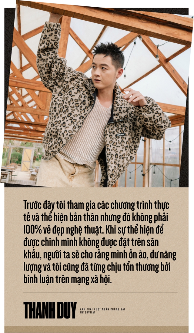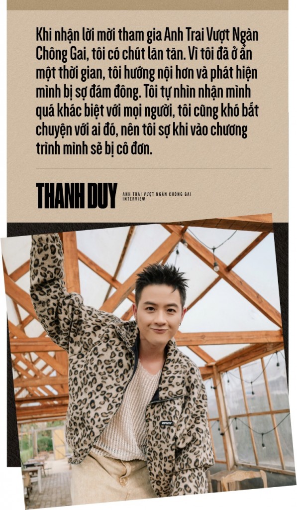 Sau một thời gian ở ẩn để tự chữa lành từ bên trong, Thanh Duy lần nữa tham gia một chương trình thực tế - một quyết định khá khó hiểu, tại sao? Bởi lẽ cũng chính gameshow từng khiến Thanh Duy đứng trước bùa rìu dư luận, người ta nói nam ca sĩ quá ồn ào, quá dư năng lượng và... quá là chính mình. Ngay khi mở đầu buổi trò chuyện, tôi cũng đã bày tỏ sự thắc mắc, vì sao Thanh Duy quay lại chương trình thực tế, chấp nhận đương đầu với sự tổn thương, Thanh Duy đáp rất ngắn gọn: bởi vì Anh Trai Vượt Ngàn Chông Gai có một sân khấu cho nghệ sĩ.
