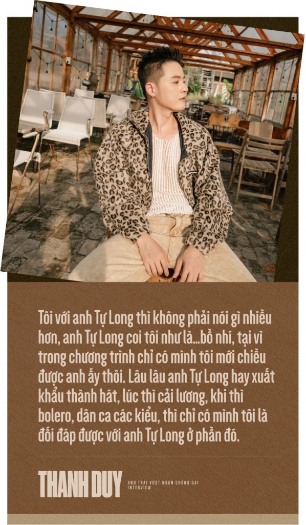 Còn anh Tự Long thì không phải nói gì nhiều hơn, anh Tự Long coi tôi như là…bồ nhí. Tại vì trong chương trình chỉ có mình tôi mới chiều được ổng thôi. Lâu lâu anh Tự Long hay xuất khẩu thành hát, lúc thì cải lương, khi thì bolero, dân ca các kiểu, thì chỉ có mình Duy là đối đáp được với anh Tự Long ở phần đó. Thật sự hai anh em đã rất quý nhau trước đó và vào chương trình Anh Trai Vượt Ngàn Chông Gai như kiểu được trùng phùng vậy.
