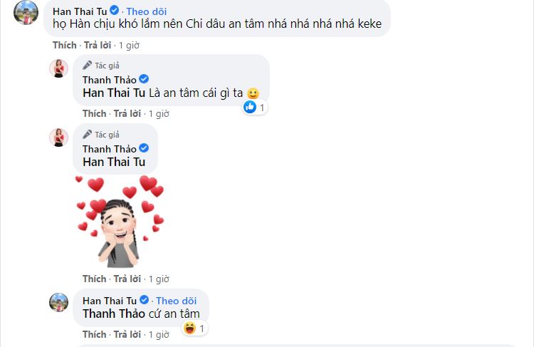 Đáng chú ý, nam ca sĩ Hàn Thái Tú còn ẩn ý nhắc tới chồng của Thanh Thảo - doanh nhân Tom Han rằng: "Họ Hàn chịu khó lắm nên chị dâu an tâm nha". Sau đó, Thanh Thảo cũng đáp lại úp mở không kém: "Là an tâm cái gì ta".