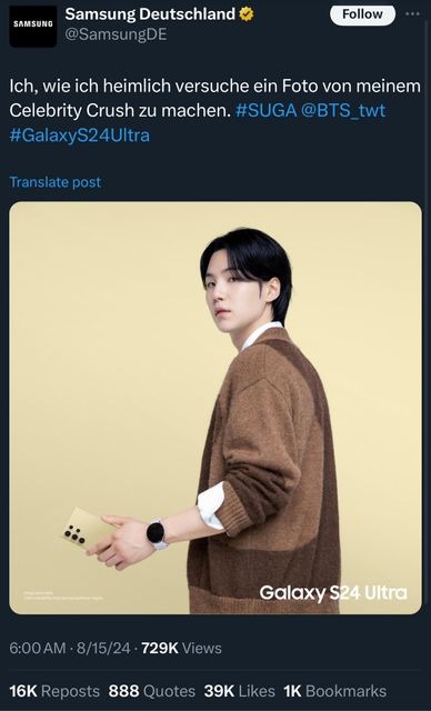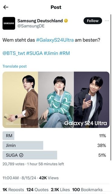 Trong những năm qua, BTS là gương mặt đại diện của thương hiệu Samsung. Vào ngày 15/8, tài khoản Samsung Đức đã đăng tải ảnh quảng cáo của Suga, sau đó là cuộc thăm dò ý kiến giữa Suga, Jimin và RM. Tuy nhiên sau khi Suga giành được nhiều phiếu bầu nhất, tài khoản Samsung Đức đã lặng lẽ xóa cả 2 bài đăng có mặt nam idol.