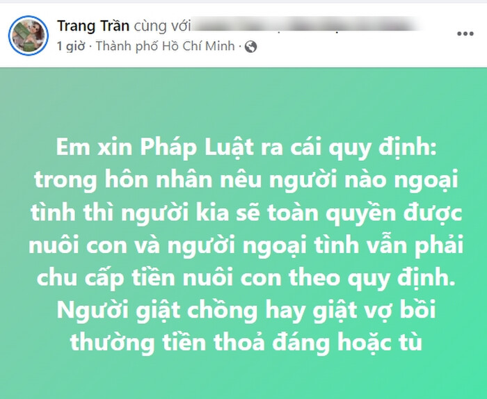 Trang Khàn cũng nói thêm rằng cần phải có biện pháp trừng trị đối với tiểu tam: "Em xin Pháp luật ra cái quy định: Trong hôn nhân nếu người nào ngoại tình thì người kia sẽ toàn quyền được nuôi con và người ngoại tình vẫn phải chu cấp tiền nuôi con theo quy định. Người giật chồng hay giật vợ bồi thường tiền thoả đáng hoặc tù".