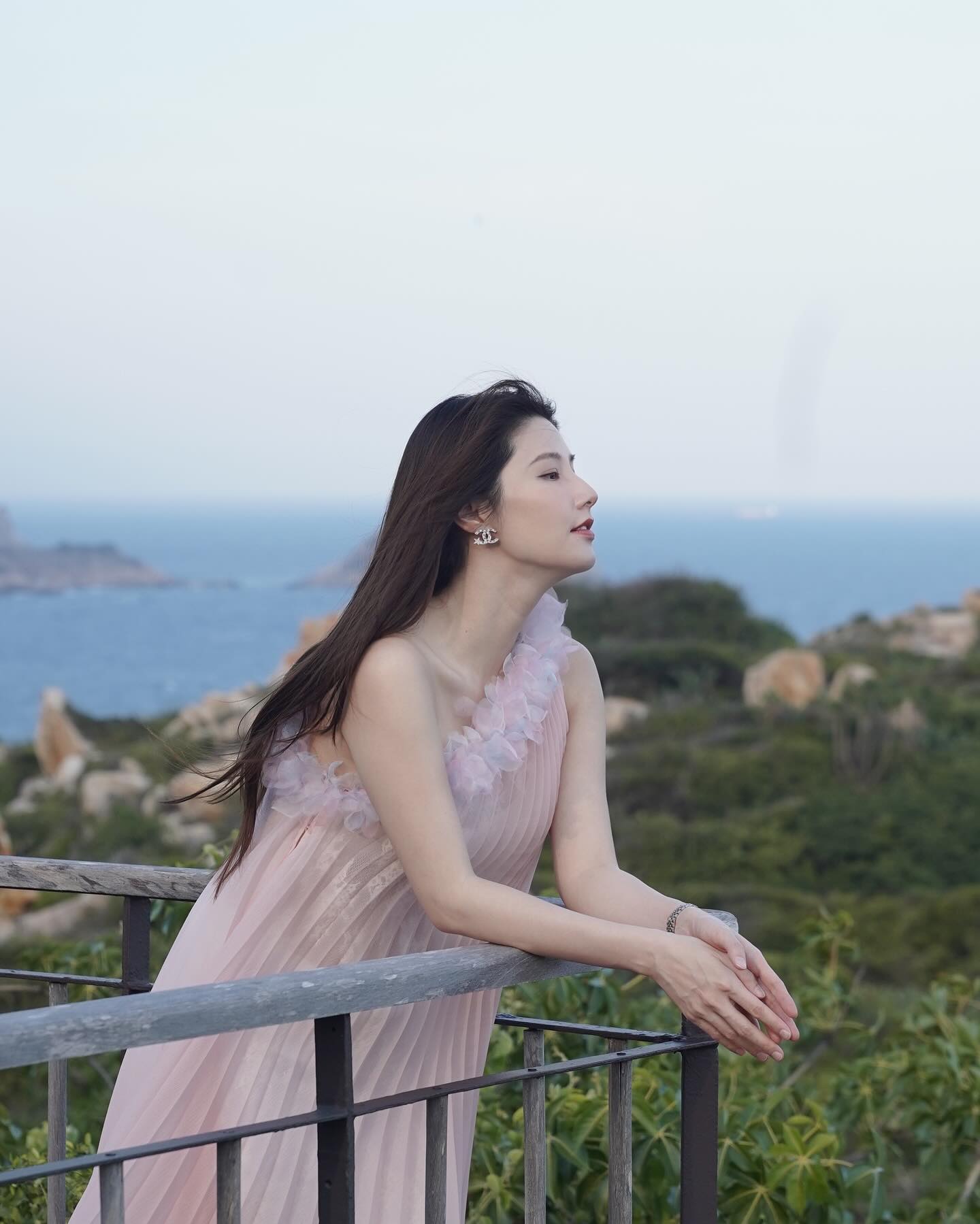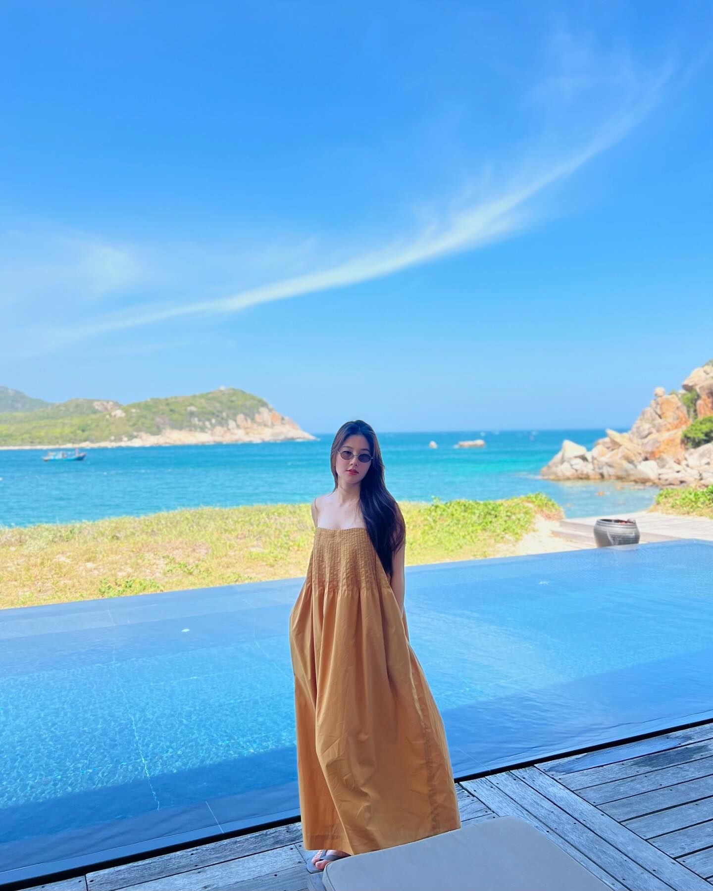 Mới đây, vợ chồng Diễm My 9X - Vinh Nguyễn có chuyến nghỉ dưỡng sang chảnh cùng NTK Adrian Anh Tuấn. Trước kia, phu nhân hào môn thường xuyên lên đồ bó sát, hay diện bikini để thả dáng khi đi du lịch biển nhưng lần này cô chỉ mặc váy thùng thình, mang dép bệt và di chuyển từ tốn.