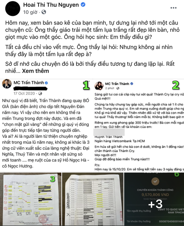 Bức xúc khi thấy ông xã Hari Won bị chỉ trích một cách vô lý, Hoa hậu Thu Hoài - một trong những người bạn thân thiết nhất của Trấn Thành trong showbiz - đã lập tức đăng đàn bênh vực đồng nghiệp. Cô chia sẻ status sao kê của Trấn Thành và viết: "Hôm nay, xem bản sao kê của bạn mình, tự dưng lại nhớ tới một câu chuyện cũ: Ông thầy giáo trải một tấm lụa trắng rất đẹp lên bàn, nhỏ giọt mực vào một góc. Ông hỏi học sinh: Em thấy điều gì? Tất cả đều chỉ vào vết mực. Ông thầy lại hỏi: Nhưng không ai nhìn thấy đây là một tấm lụa rất đẹp à?