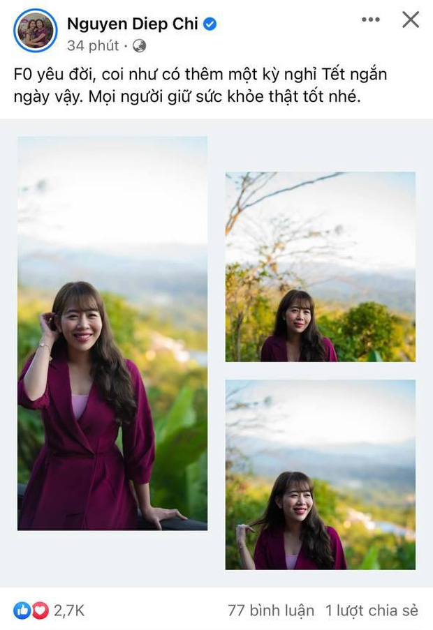 "F0 yêu đời, coi như có thêm một kỳ nghỉ Tết ngắn ngày vậy. Mọi người giữ sức khỏe thật tốt nhé", MC Diệp Chi viết.