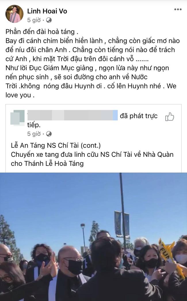 Đặc biệt, nghệ sĩ Hoài Linh đã tiếp tục theo dõi và cập nhật từng đoạn livestream trong suốt buổi lễ an táng và hỏa táng. Khi linh cữu của nghệ sĩ Chí Tài được đưa đến đài hỏa táng, nghệ sĩ Hoài Linh cũng xúc động tâm sự: "Bay đi cánh chim biển hiền lành, chẳng còn giấc mơ nào để níu đôi chân anh. Chẳng còn tiếng nói nào để trách cứ anh, khi mặt trời đậu trên đôi cánh vỗ... Không nóng đâu huynh hơi, cố lên huynh nhé. Chúng em yêu anh".