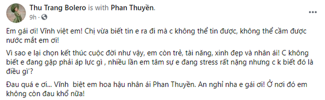 Thu Trang tiếc thương: "Vì sao em lại chọn kết thúc cuộc đời như vậy, em còn trẻ, tài năng, xinh đẹp và nhân ái! Chị không biết em đang gặp phải áp lực gì, nhiều lần em tâm sự em đang stress rất nặng nhưng chị không biết đó là điều gì? Đau quá e ơi... Vĩnh biệt em hoa hậu nhân ái Phan Thuyền. An nghỉ nha em gái ơi! Ở nơi đó em không còn đau khổ nữa!".