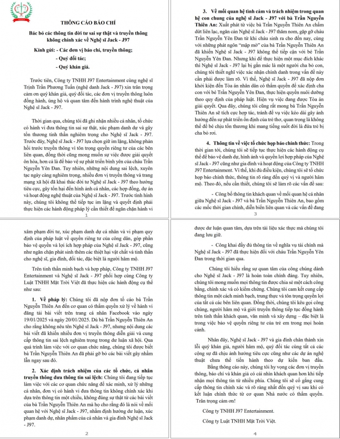Không chỉ thế, Jack còn khẳng định Thiên An chính là người chấm dứt liên lạc, ngăn không cho thăm nom, gặp gỡ con gái. Chứ không phải Jack "bỏ con" hay thiếu trách nhiệm với Yên Đan. Thông qua thông cáo này, phía Jack mong "Thiên An sẽ tích cực hợp tác, tránh để vụ việc kéo dài gây ảnh hưởng đến sự phát triển ổn định của trẻ thơ, quan trọng là không thể để bé chịu tổn thương khi mang tiếng suốt đời là đứa trẻ bị cha bỏ rơi".