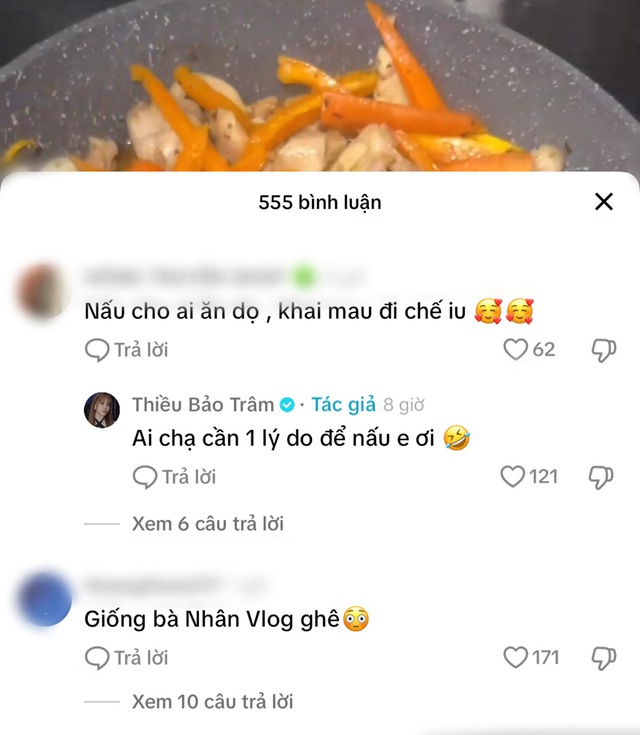 Một cư dân mạng đã để lại bình luận dò hỏi Thiều Bảo Trâm: “Nấu cho ai ăn vậy. Khai mau đi chế yêu”. Sau đó, nữ ca sĩ sinh năm 1994 đã trả lời ẩn ý: “Ai chả cần một lý do để nấu em ơi”. Cư dân mạng liền rộ nghi vấn Thiều Bảo Trâm và bạn trai kém 10 tuổi đang ở chung một nhà.